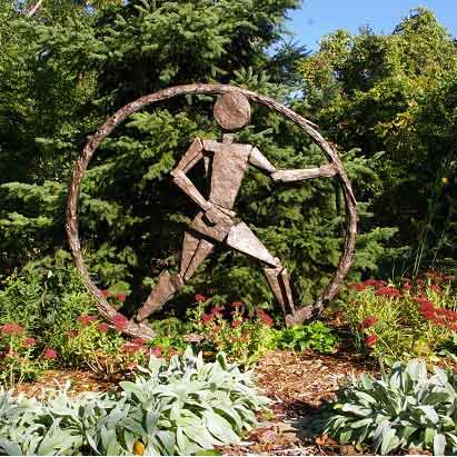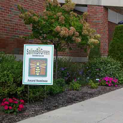 It is planted in a half circle motif with hardy shrubs and perennials. Some annuals are inserted each year for consistent color. Saline Stone and Thistle members maintain the garden by watering and weeding through the gardening season.